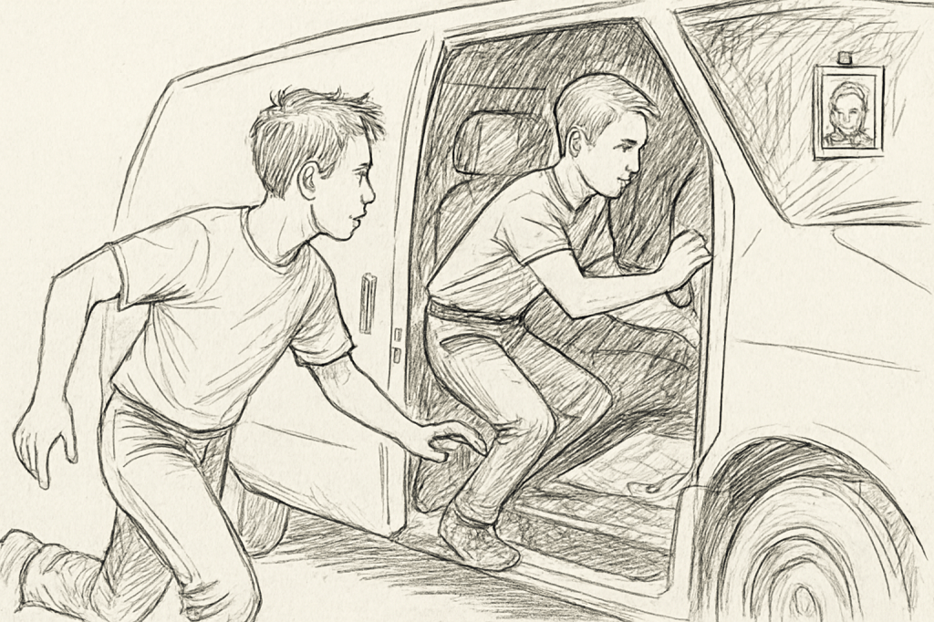 The boys hid their fishing poles in the brush and stalked the mysterious white van, following the sounds of the engine. The forest floor darkened. Only the skittering of small animals in the brush and the snapping of twigs beneath their feet broke the stillness.