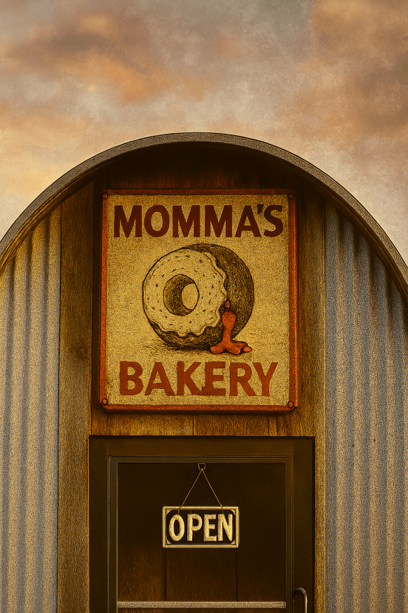 Hallie saw the sign on a bright yellow Quonset hut. It had a large donut with red jelly oozing like a waterfall, and it read Momma’s Bakery. Her stomach growled.